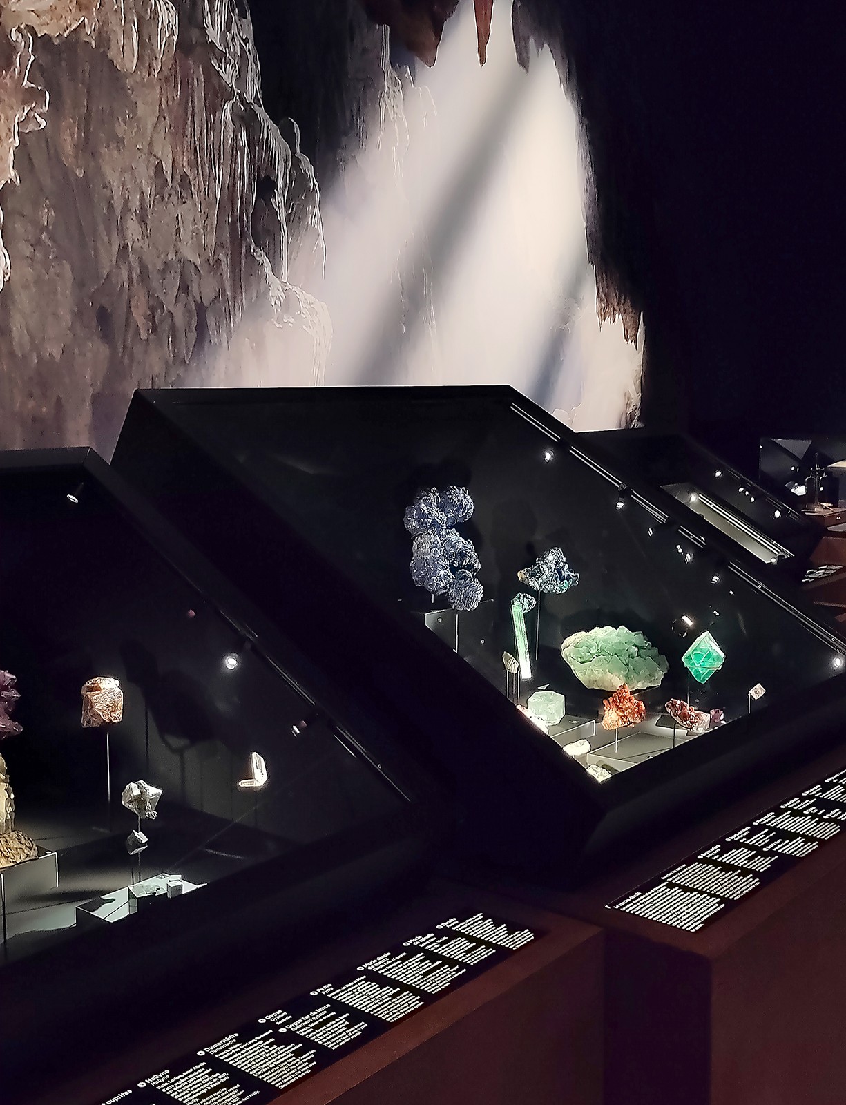 Cette exposition a pour but de valoriser la collection minéralogique du musée des Confluences. Elle est organisée en 2 parties distinctes : la première est composée de vitrines-tables avec des cartels intégrés rétro-éclairés et aborde les minéraux de façon scientifique : leur formation, leur structure, leur couleur…